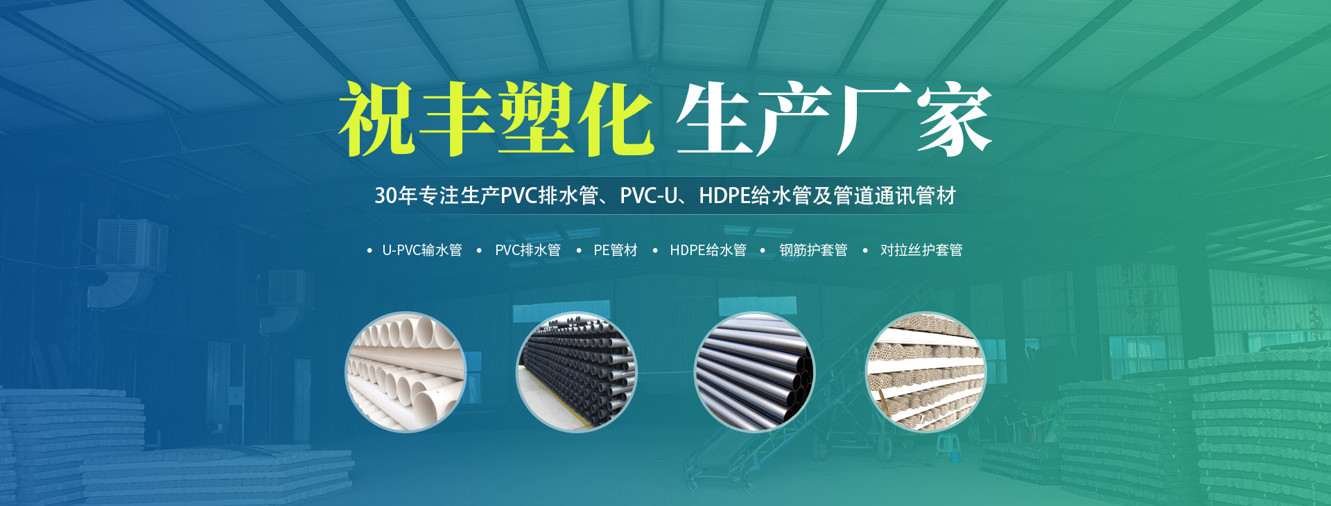 安陽市祝豐塑化有限公司坐落在滑縣工業園區,東臨大廣高速,西臨京珠高速,是鄭州、鶴壁、安陽、濮陽四個城市的輸紐,交通便利、環境優美。       公司始建于八十年代,經過二十余年的艱辛創業,規模不斷壯大,由十多萬元資產的小廠,發展到現占地面積達一萬多平,建筑面積一萬平,資產2000多萬元管材生產企業。公司生產PVC-U、PVC排水管、HDPE給水管、鋼筋護套管管道通訊管材等產品,廣泛用于農田節水、高山引水、人畜用水、建筑、電力通訊等多種用途,品種齊全。為了滿足用戶需求,可承攬各種給水、節水、灌溉工程?!白XS塑化”憑借強勁的實力,優良的管理水平?!耙再|量求生存,以信譽求發展”的原則全力以赴和大家共同塑造美好未來。..